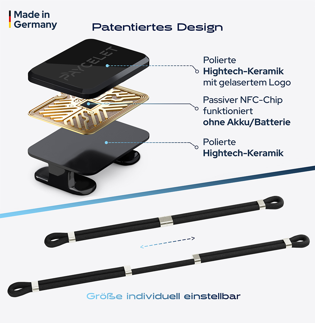 Das PAYCELET mit NFC-Chip ist aus hochwertiger Keramik gefertigt und wasser- sowie staubresistent. Das in Handarbeit gefertigte Armband aus recycelten PET-Flaschen bietet höchsten Tragekomfort im maritimen Look.